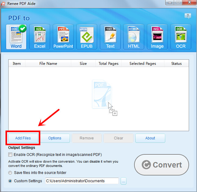 Etapa 2: Escolha um formato de saída no menu superior. Clique em Adicionar Arquivos para selecionar o PDF desejado. Marque a opção Habilitar OCR para melhorar o reconhecimento de caracteres.