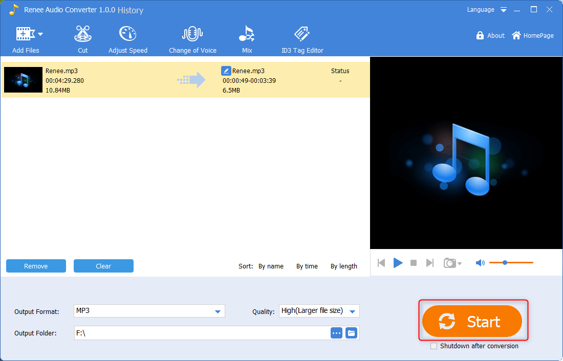 Corte de áudio corte e edite o arquivo de áudio em MP3, ACC, FLAC, APE e outros formatos. Além disso, é possível desbotar para dentro e para fora, alterar a voz masculina e feminina.